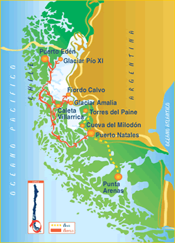 Monday:Between 08.00 hrs. and 09.30 hrs. passenger’s disembarkation. Transfer to the Punta Arenas airport, for those passengers who have hired this service (ask for rates). |